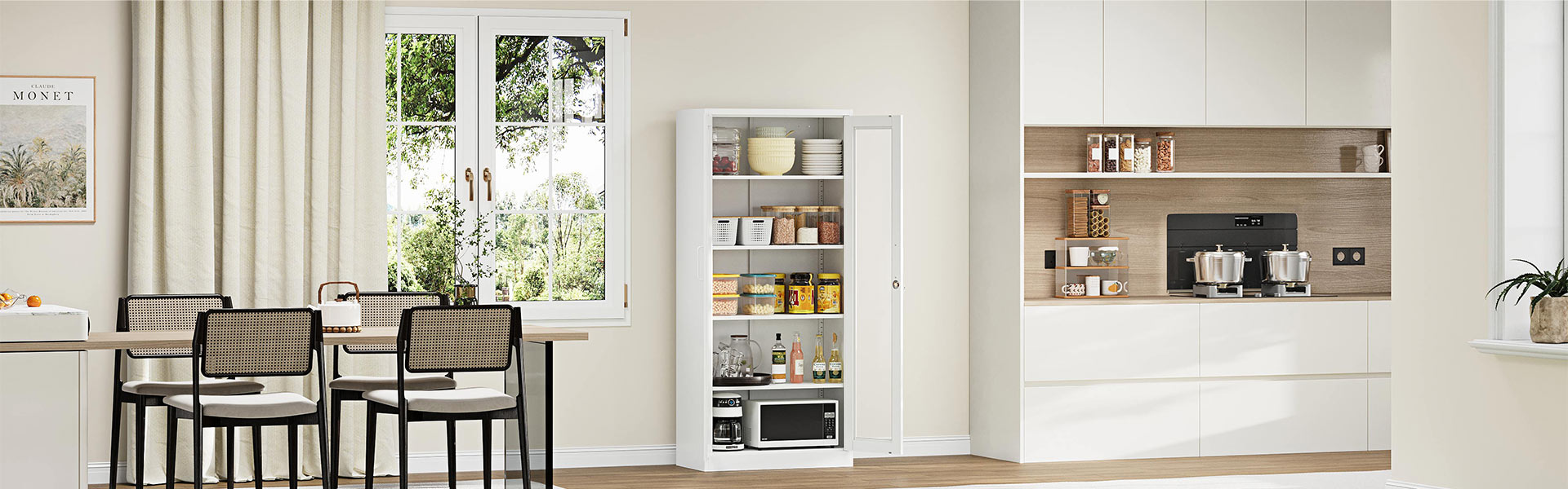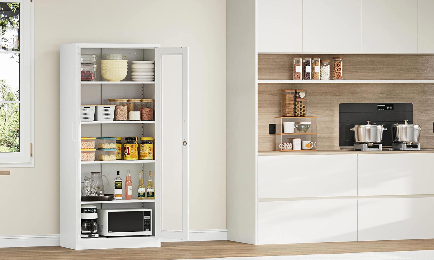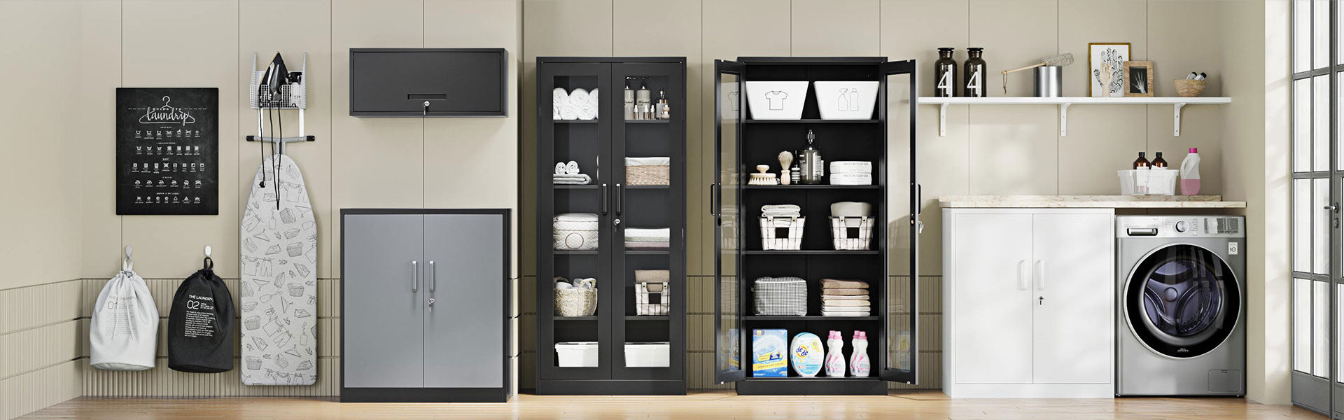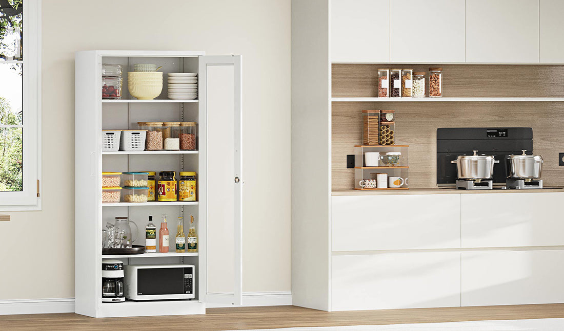 Locking Display Cabinet with Glass Doors: Equipped with 4 adjustable shelves to provide flexible storage and display space. Perfect for showcasing items like books, artifacts, or medicines, while the lock ensures secure storage for sensitive items.