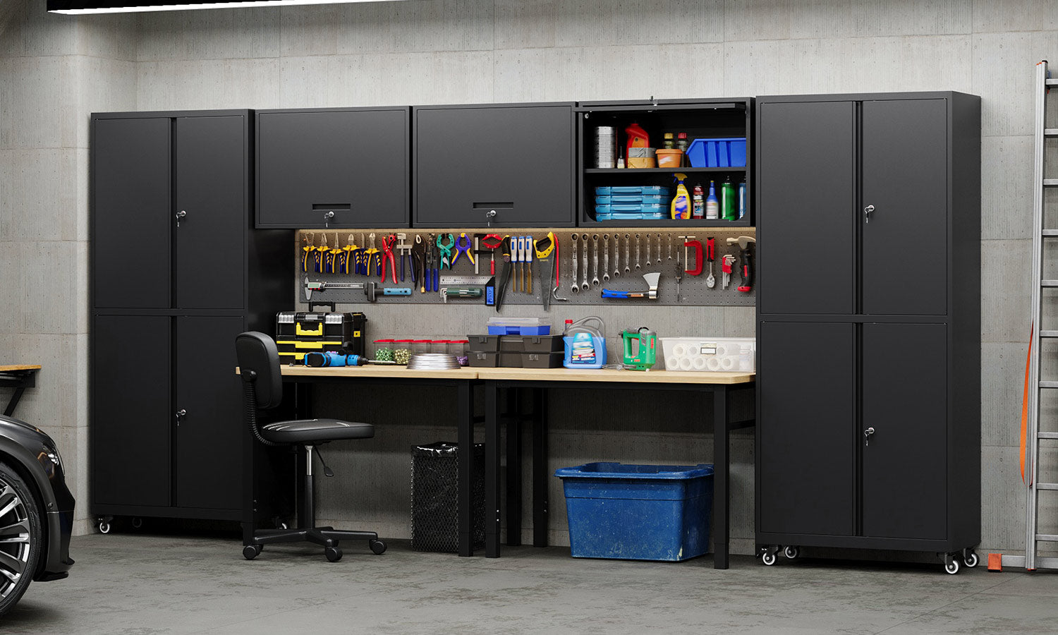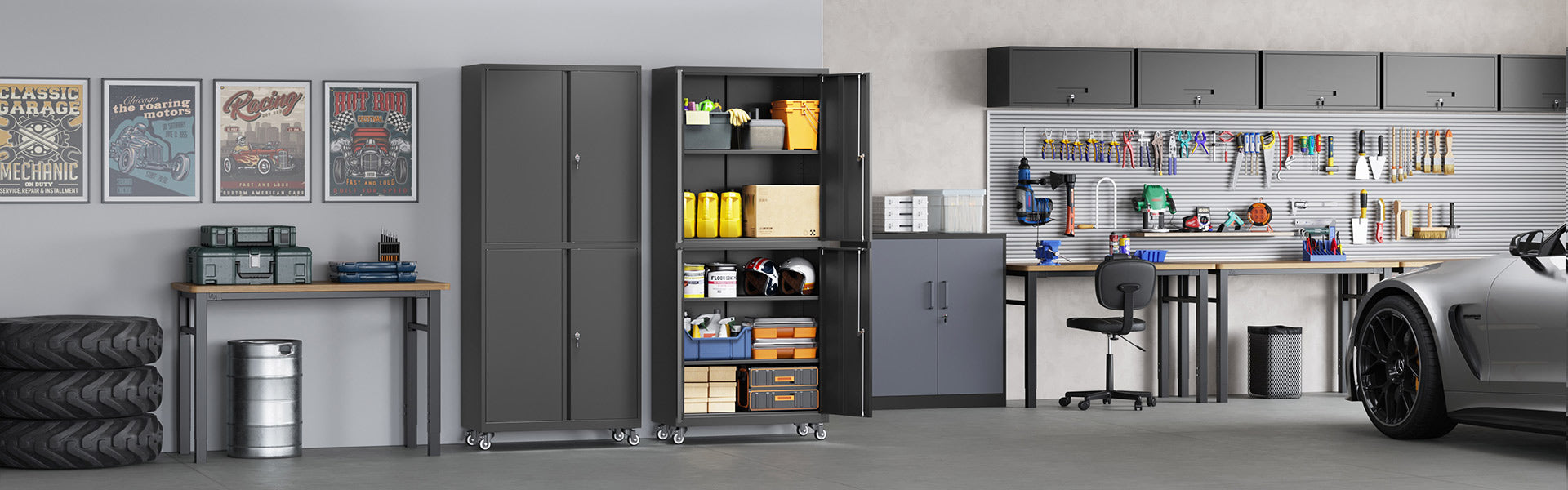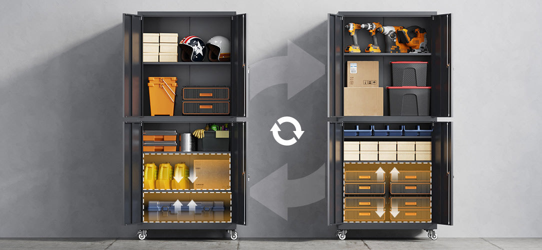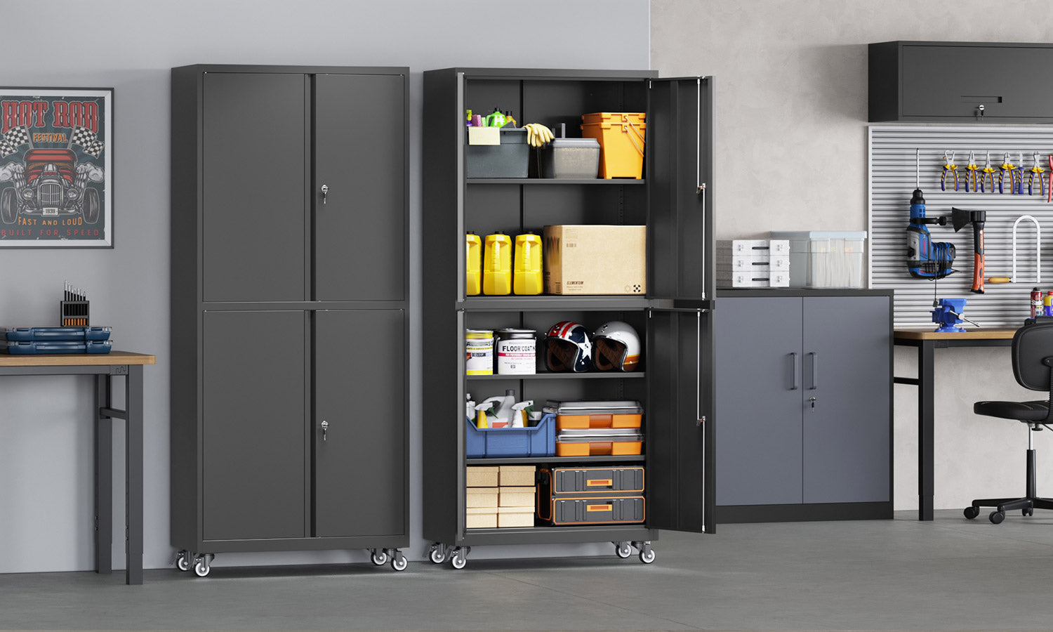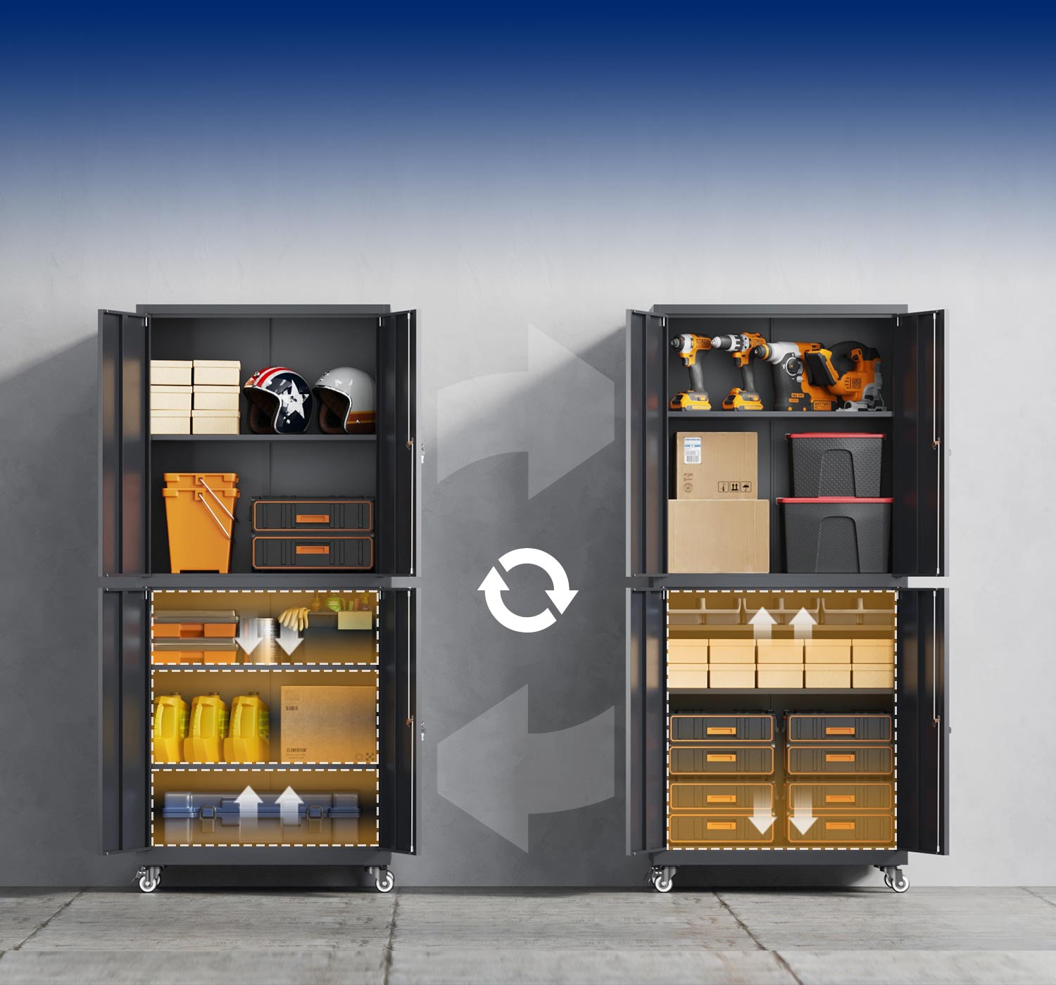 This 73" rolling metal storage cabinet features lockable doors, adjustable shelves, and four wheels for easy mobility. Built from heavy-duty cold-rolled steel with a powder-coated finish, it is waterproof, scratch- and rust-resistant—perfect for organizing garages, offices, or workshops.