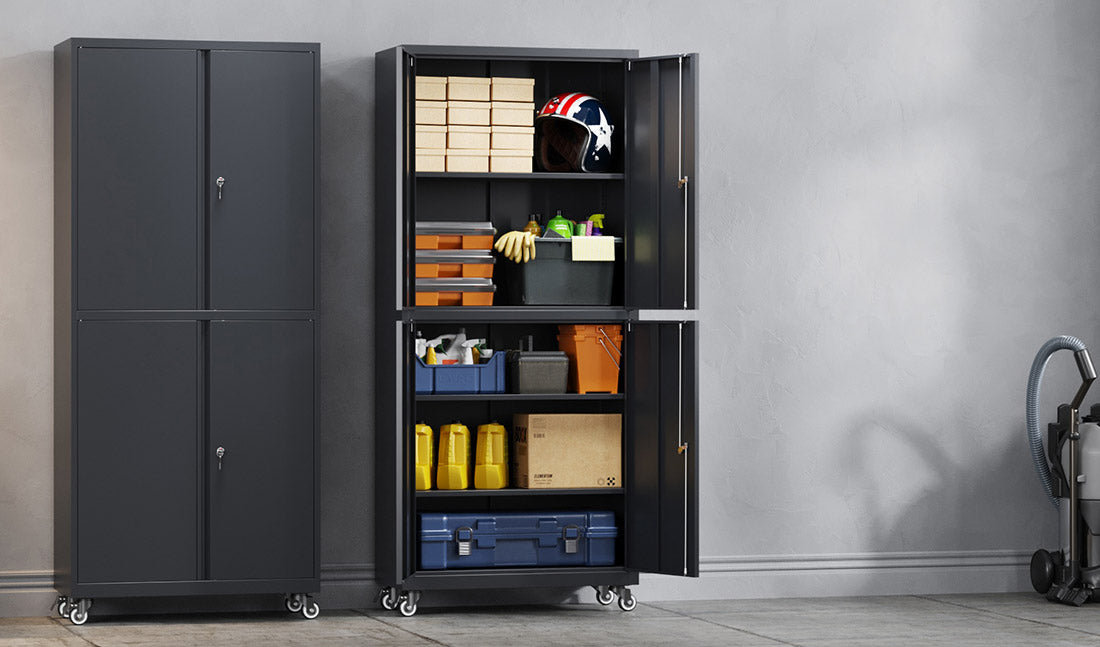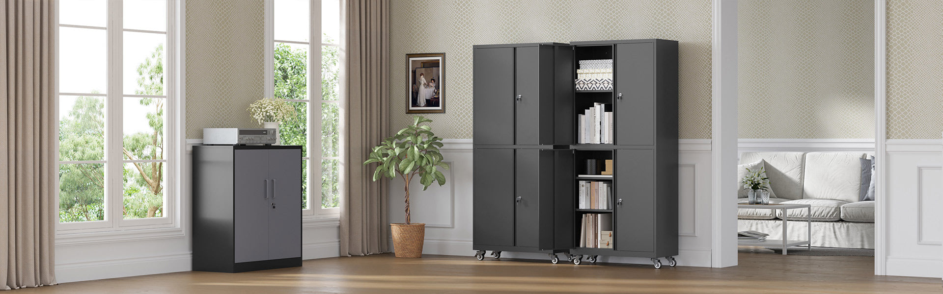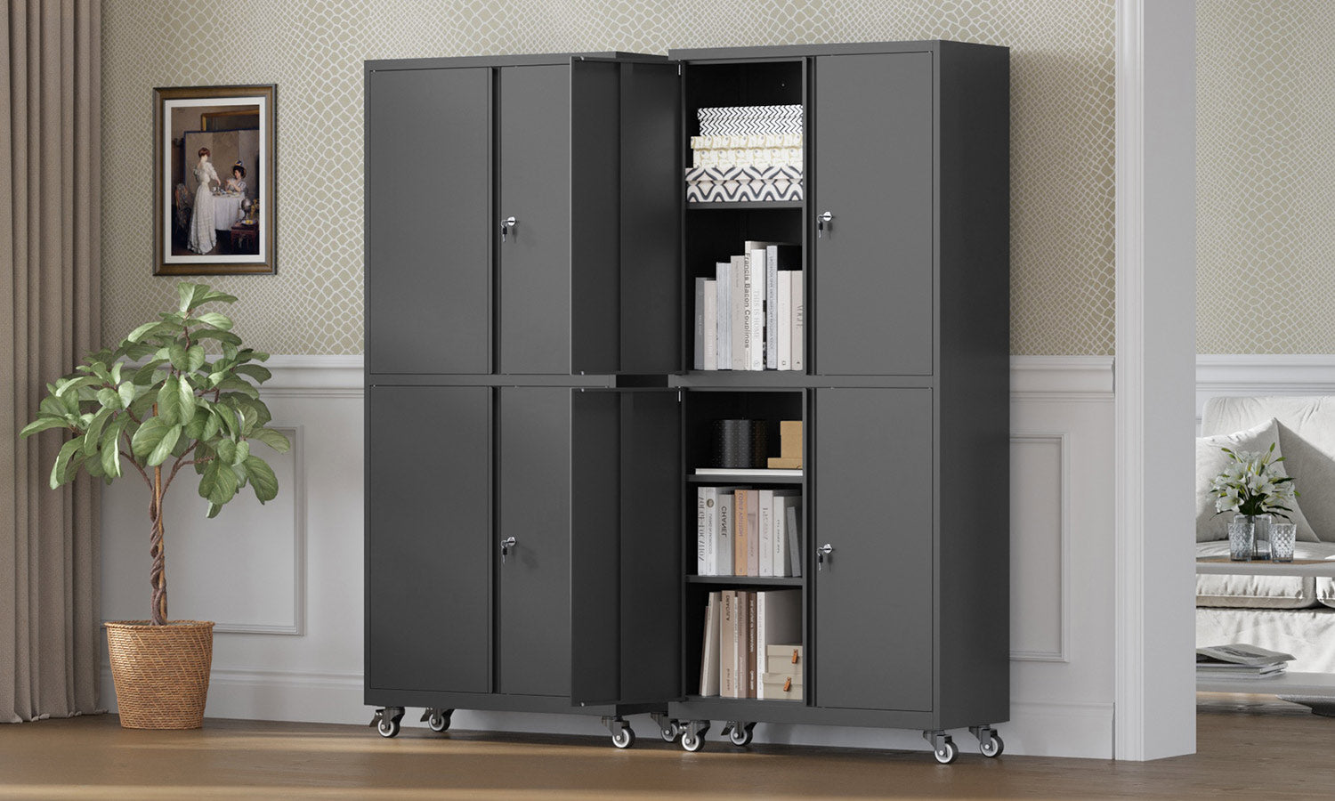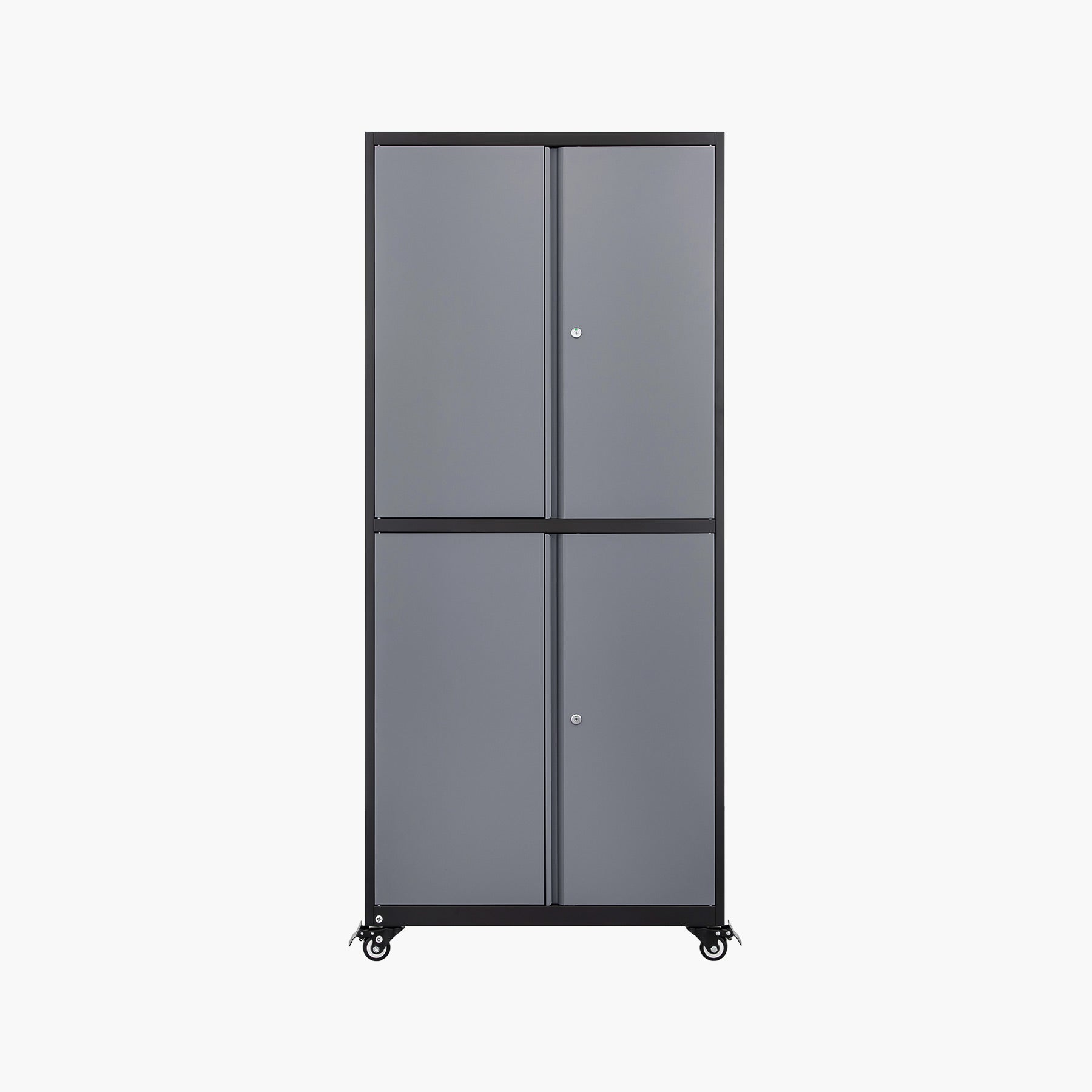 - 73" Rolling Metal Cabinet with Lock, 4 Doors & Adjustable Shelves