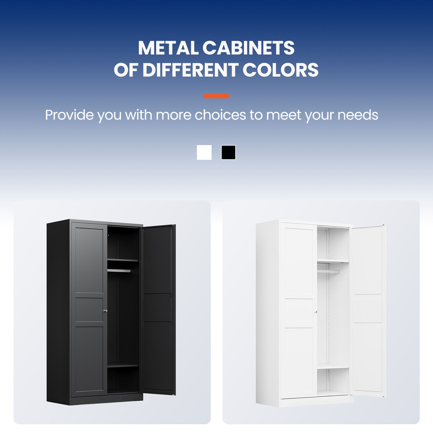 This 72" metal wardrobe armoire features adjustable shelves, a hanging rod, magnetic doors, and an anti-tilt design. Made from durable steel, it provides spacious and versatile storage for clothes, accessories, and office items.