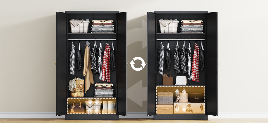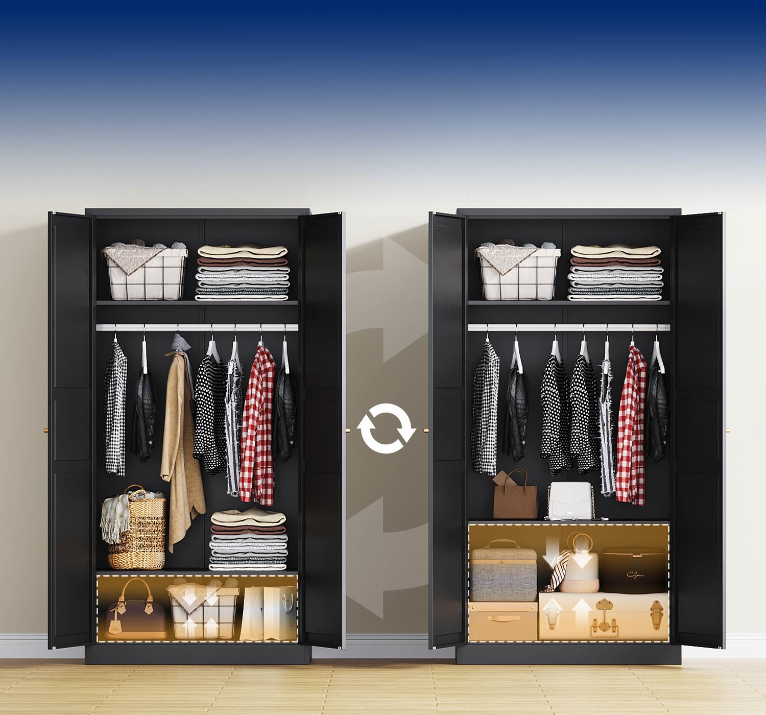 Multi-Functional: Hanging rod for garments and adjustable shelves for folded items; adapts to your storage needs.