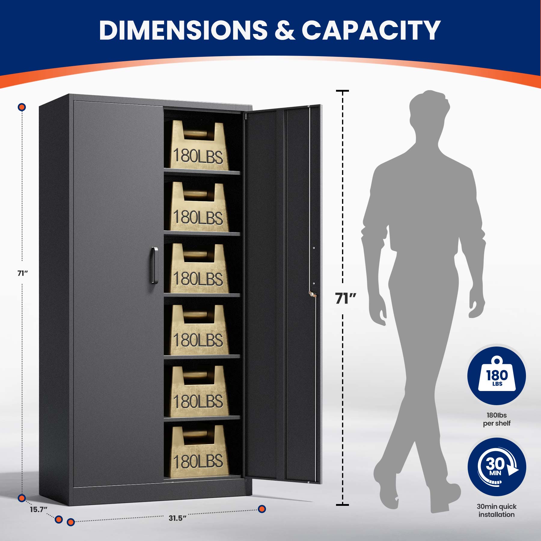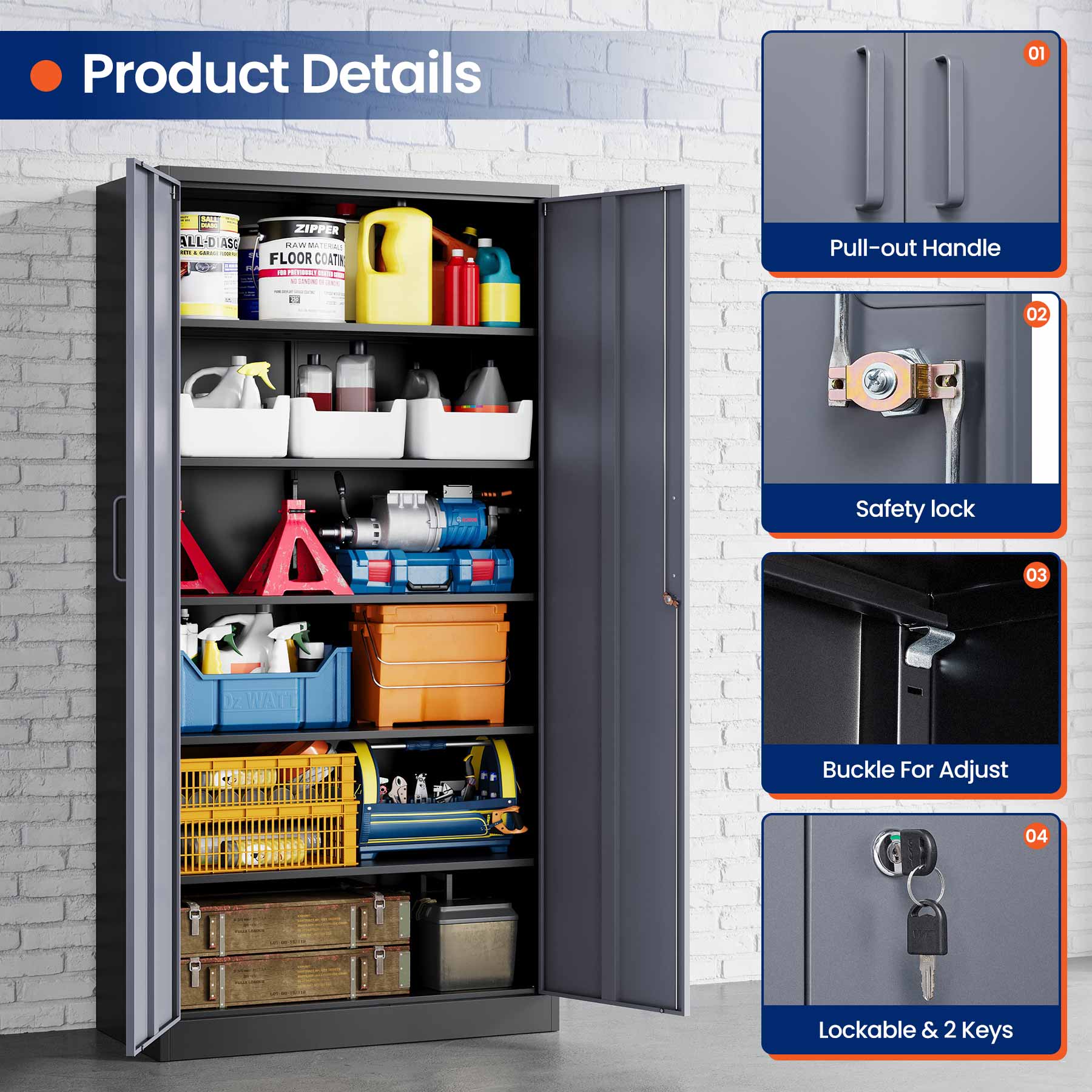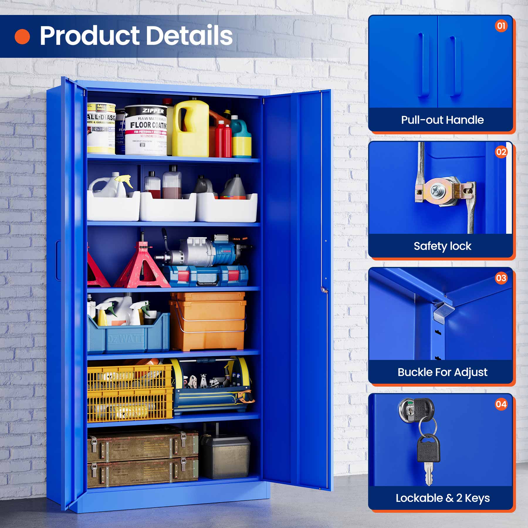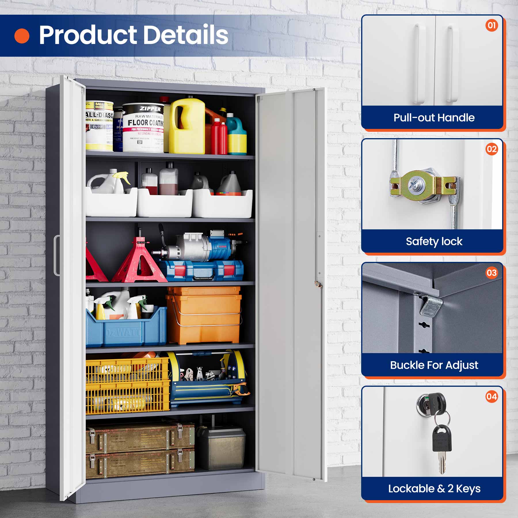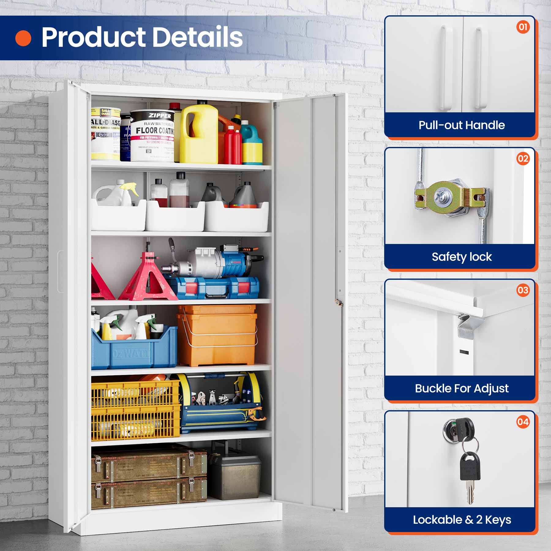 This 71"H lockable metal storage cabinet is made of heavy-duty cold-rolled steel with a rust-resistant powder coating. It features two lockable doors with two keys and five adjustable shelves that each support up to 180 lbs. Ideal for organizing tools, files, and supplies in the garage, office, or home.