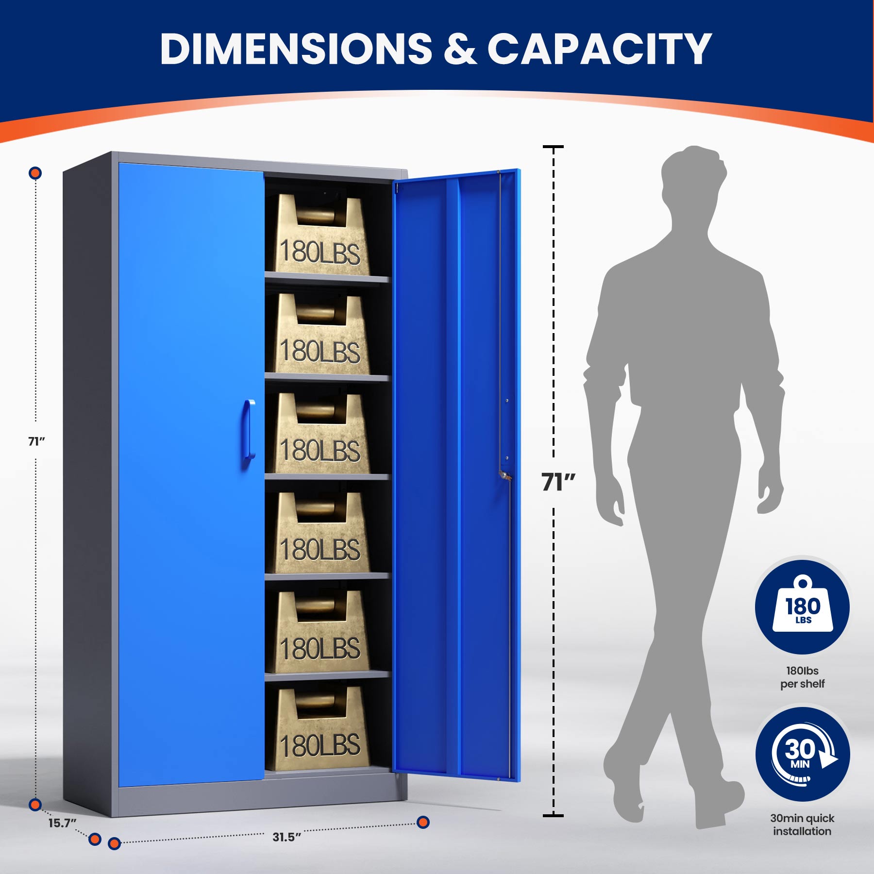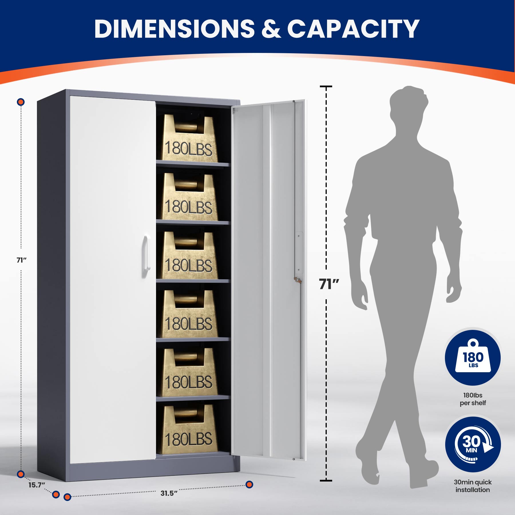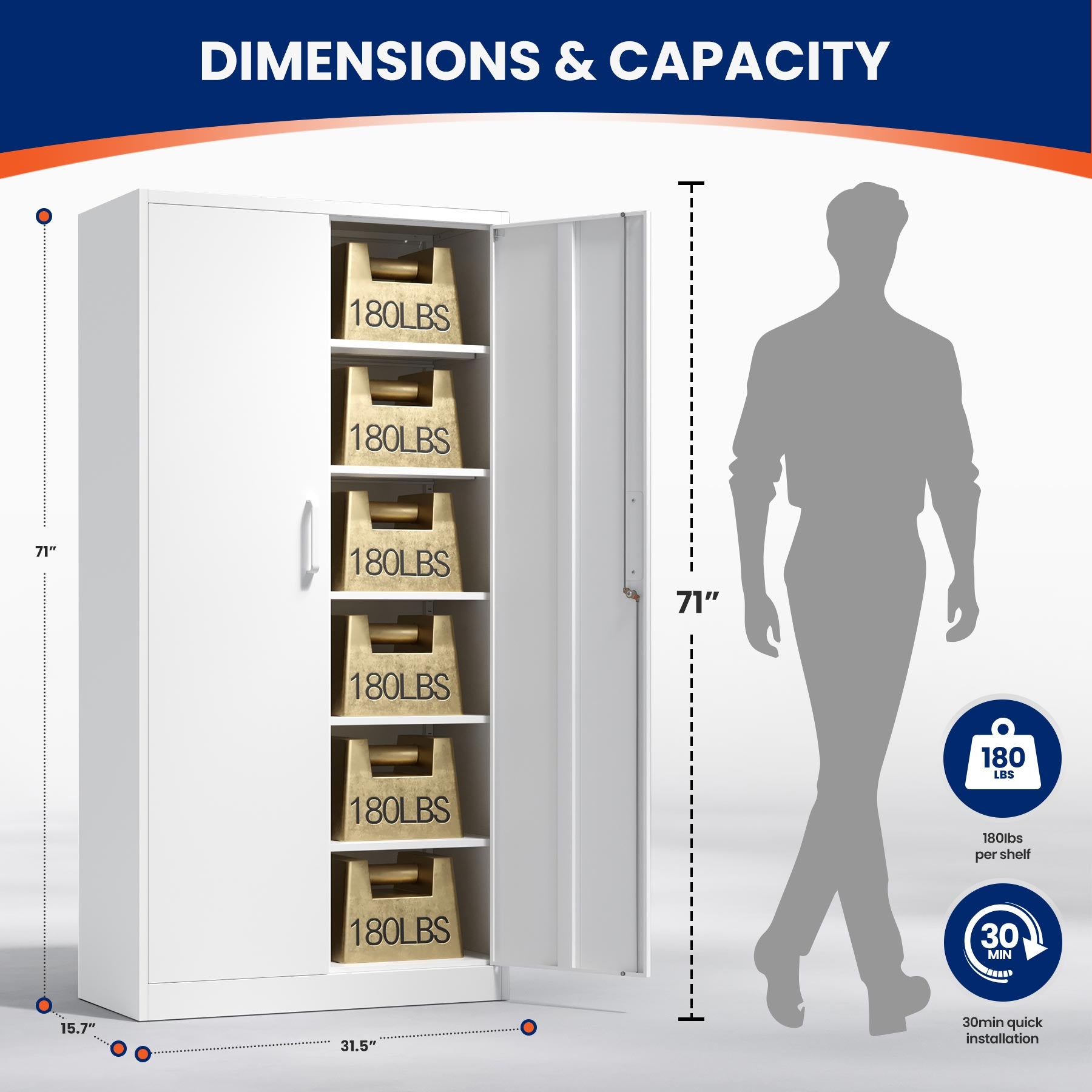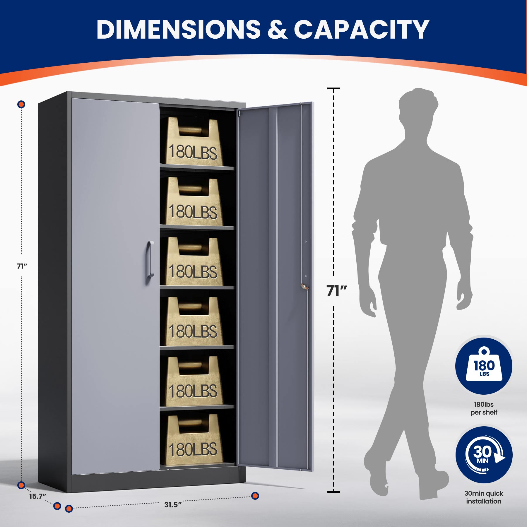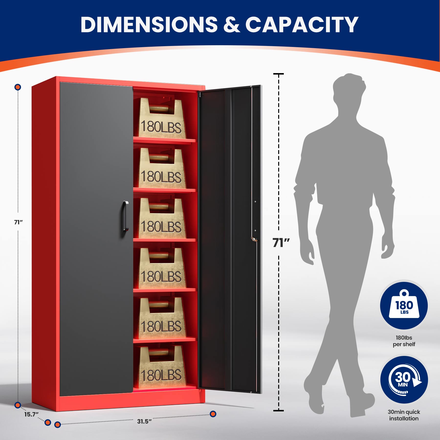 This 71"H lockable metal storage cabinet is made of heavy-duty cold-rolled steel with a rust-resistant powder coating. It features two lockable doors with two keys and five adjustable shelves that each support up to 180 lbs. Ideal for organizing tools, files, and supplies in the garage, office, or home.