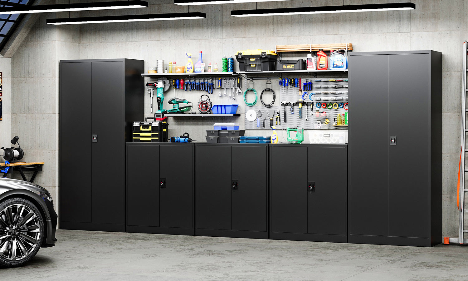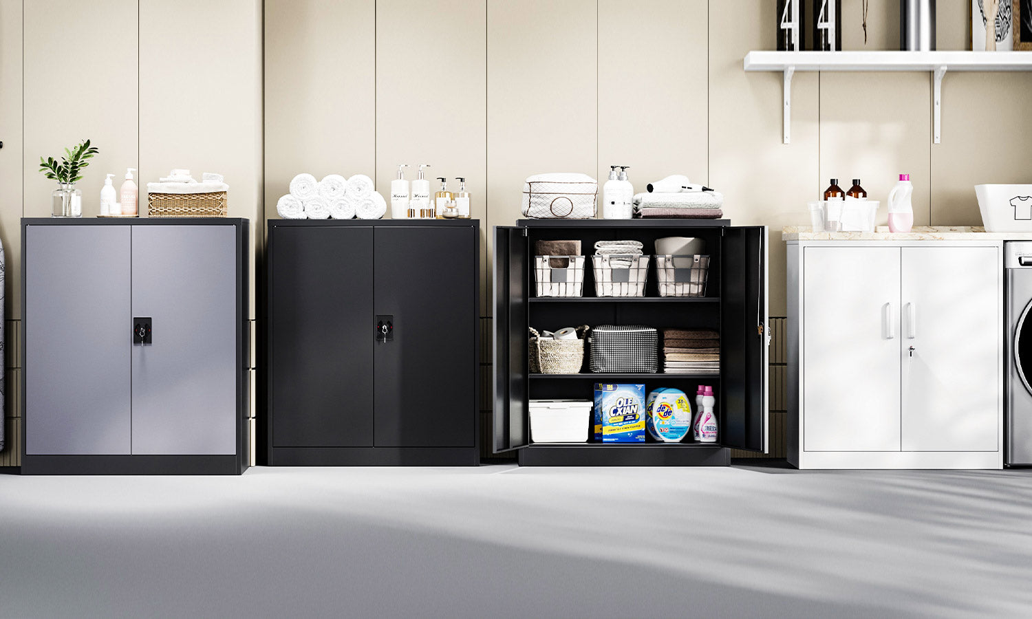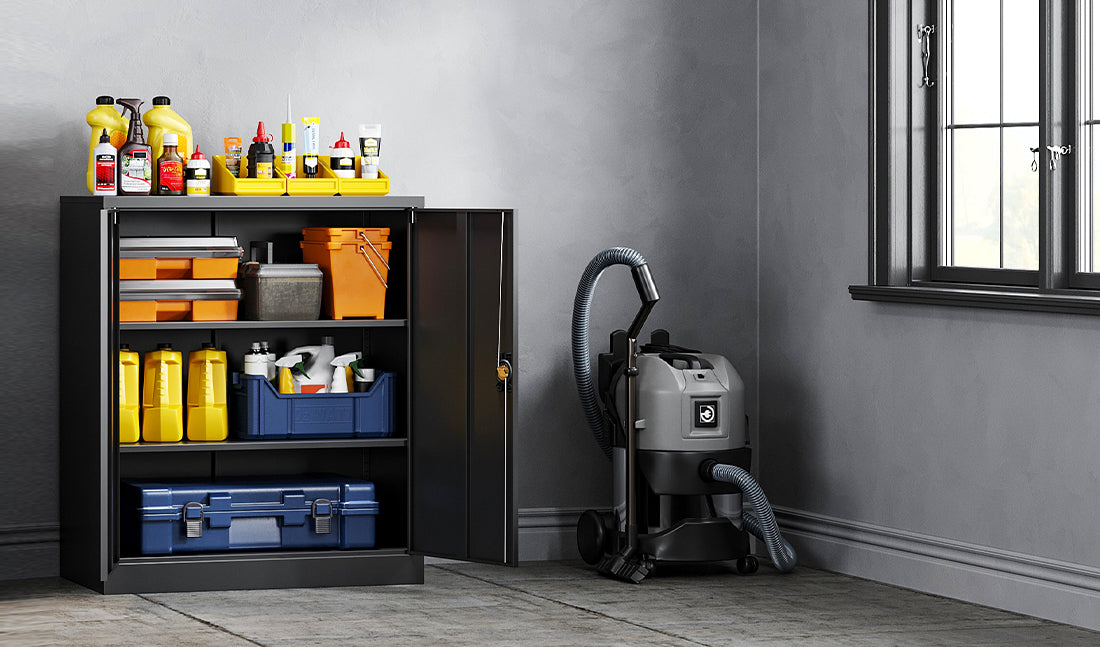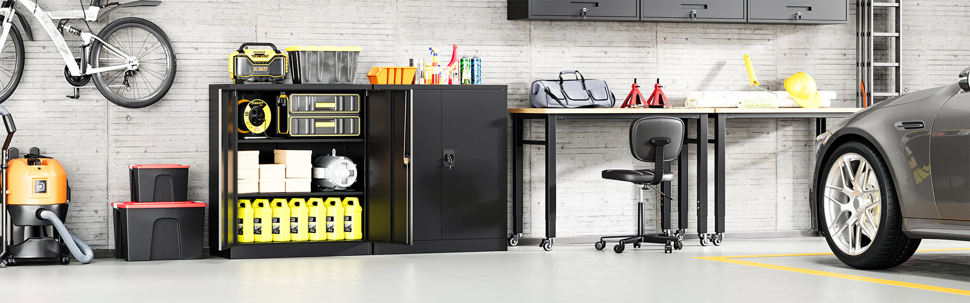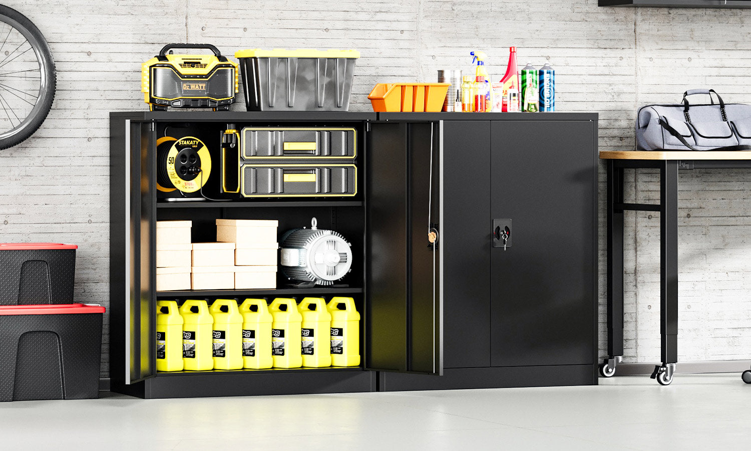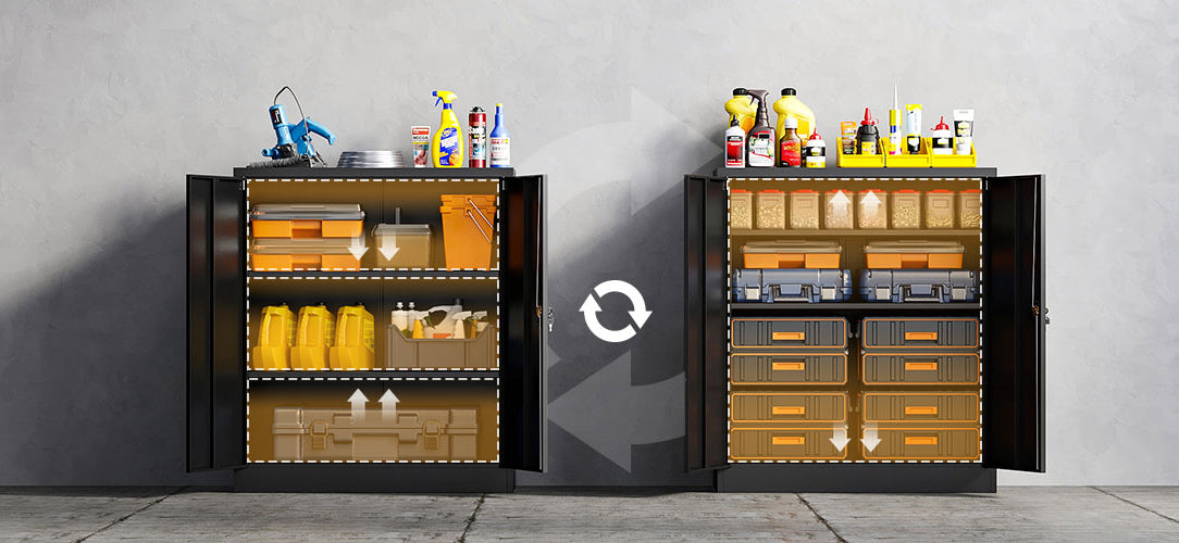 This 36" metal storage cabinet features locking doors, 2 adjustable shelves, and a sturdy steel frame. It is rust-resistant, with a powder-coated finish for long-lasting durability. Ideal for use in homes, offices, warehouses, or garages.